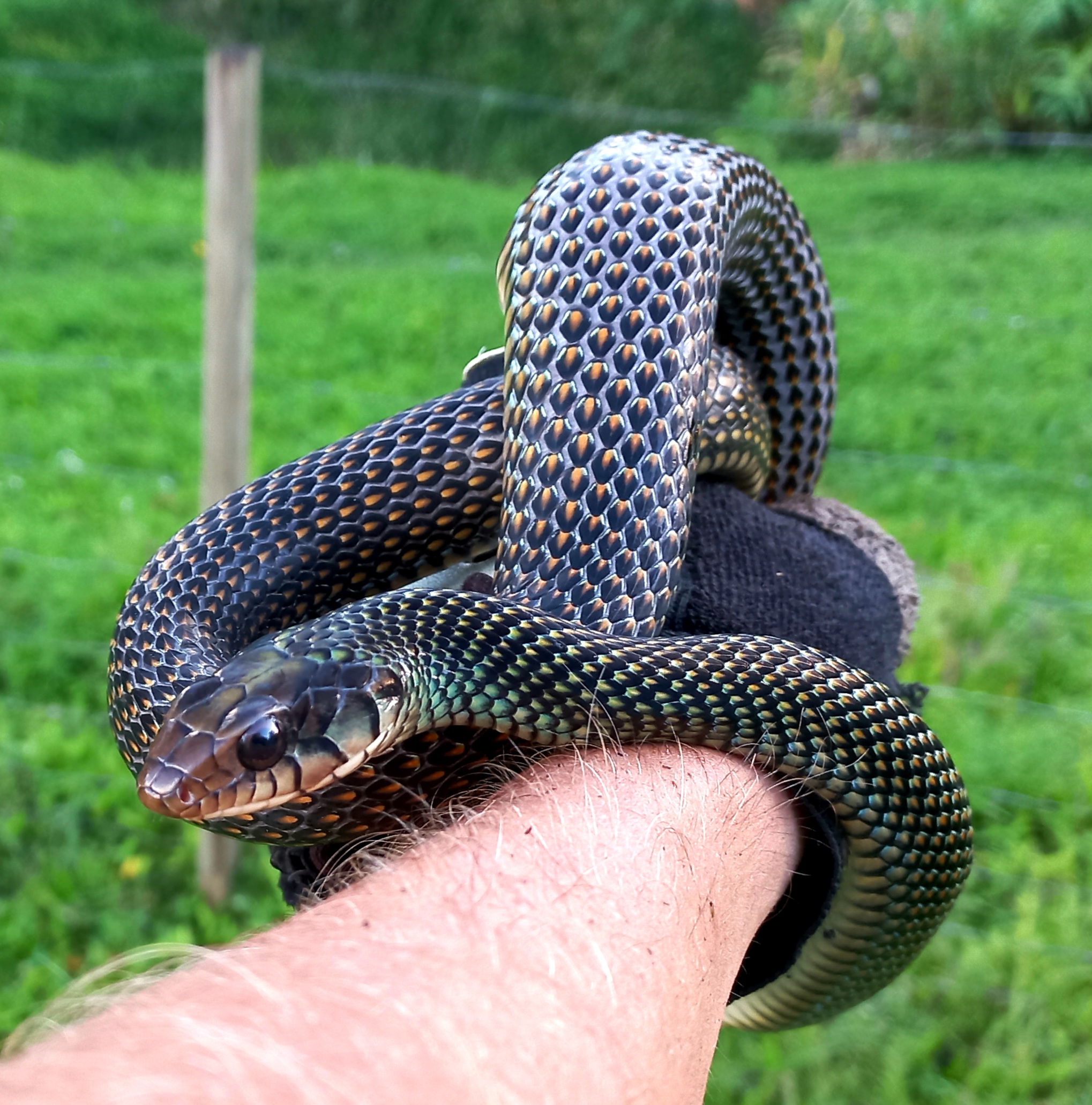 Speckled Racer snakes are actually fairly common but generally difficult to catch, hence they are a racer snake. They have always been a favorite snake of mine. The locals call them Guinea Hen Snake.