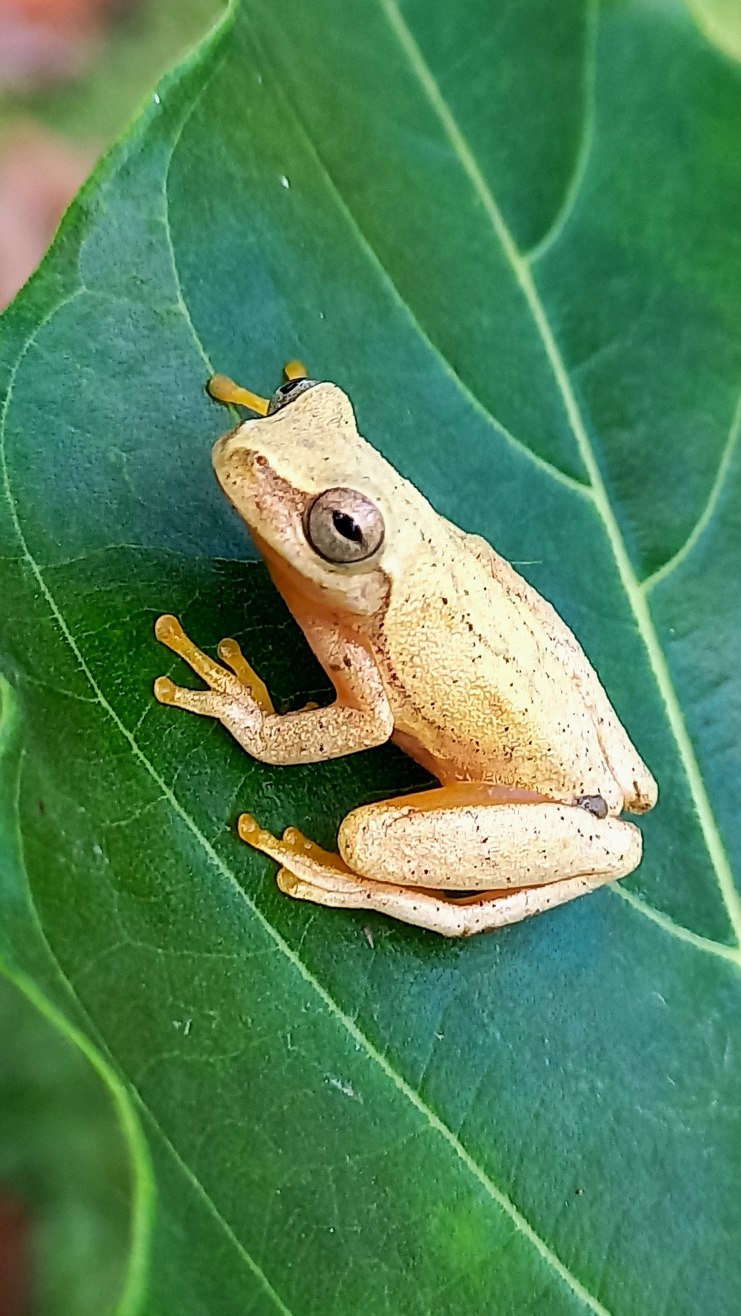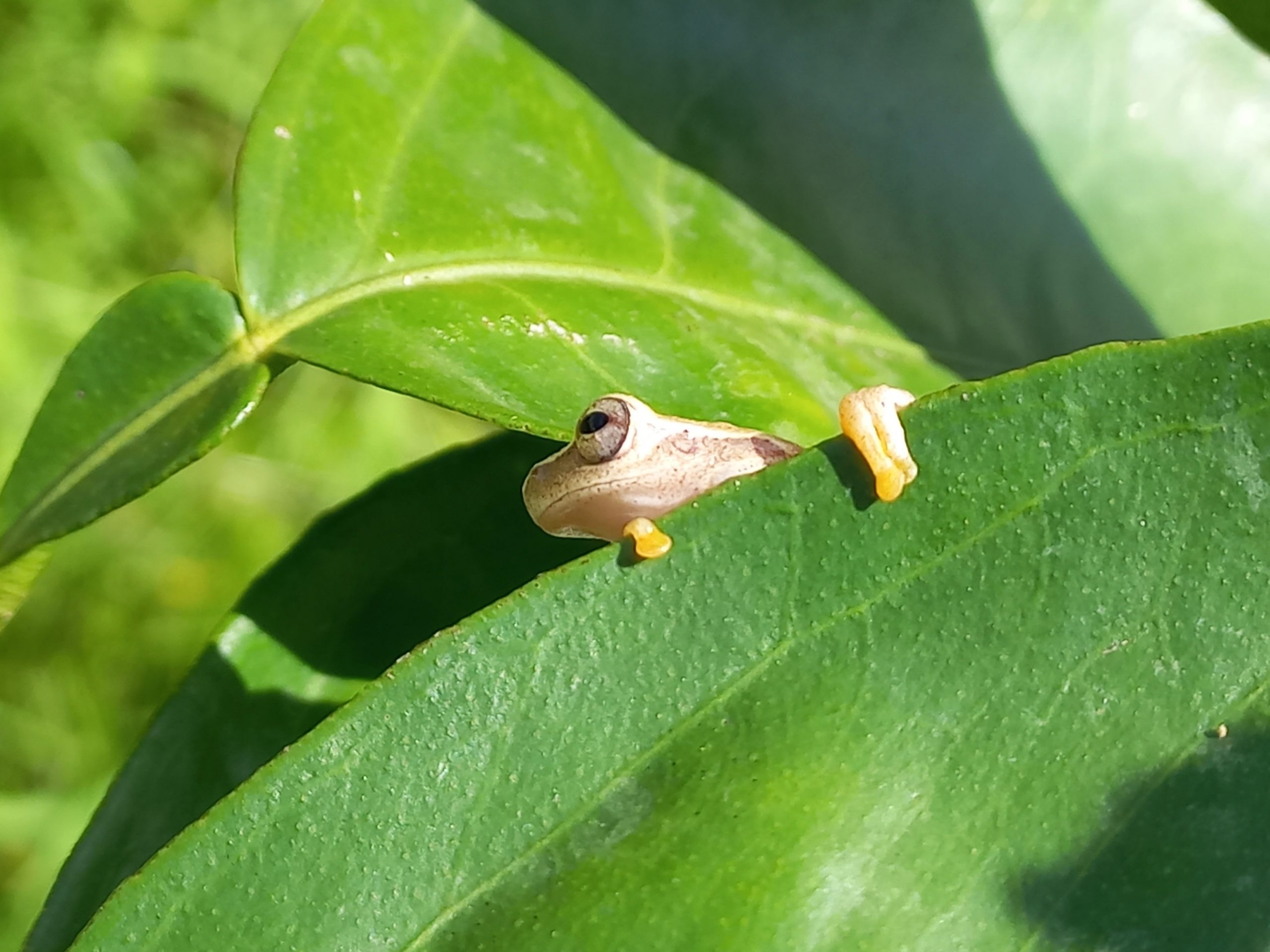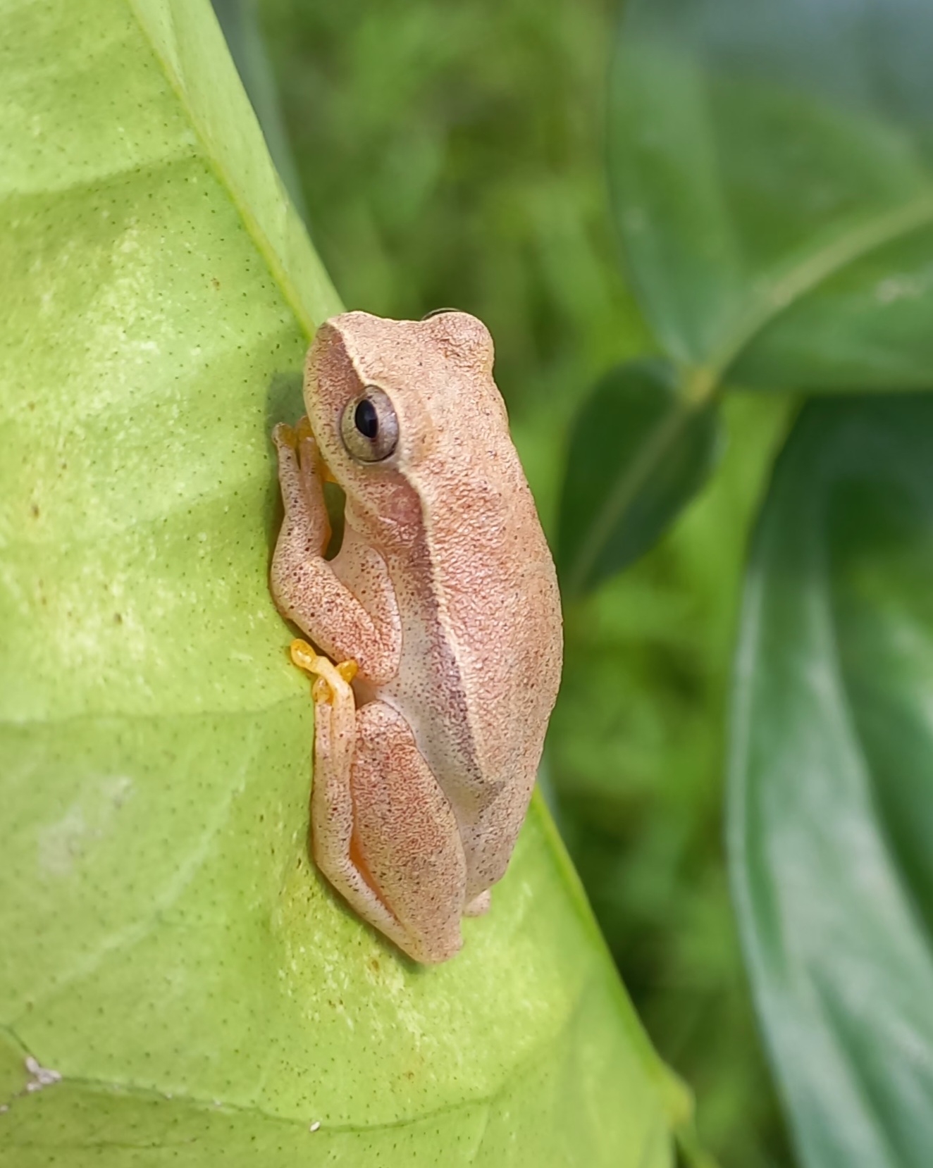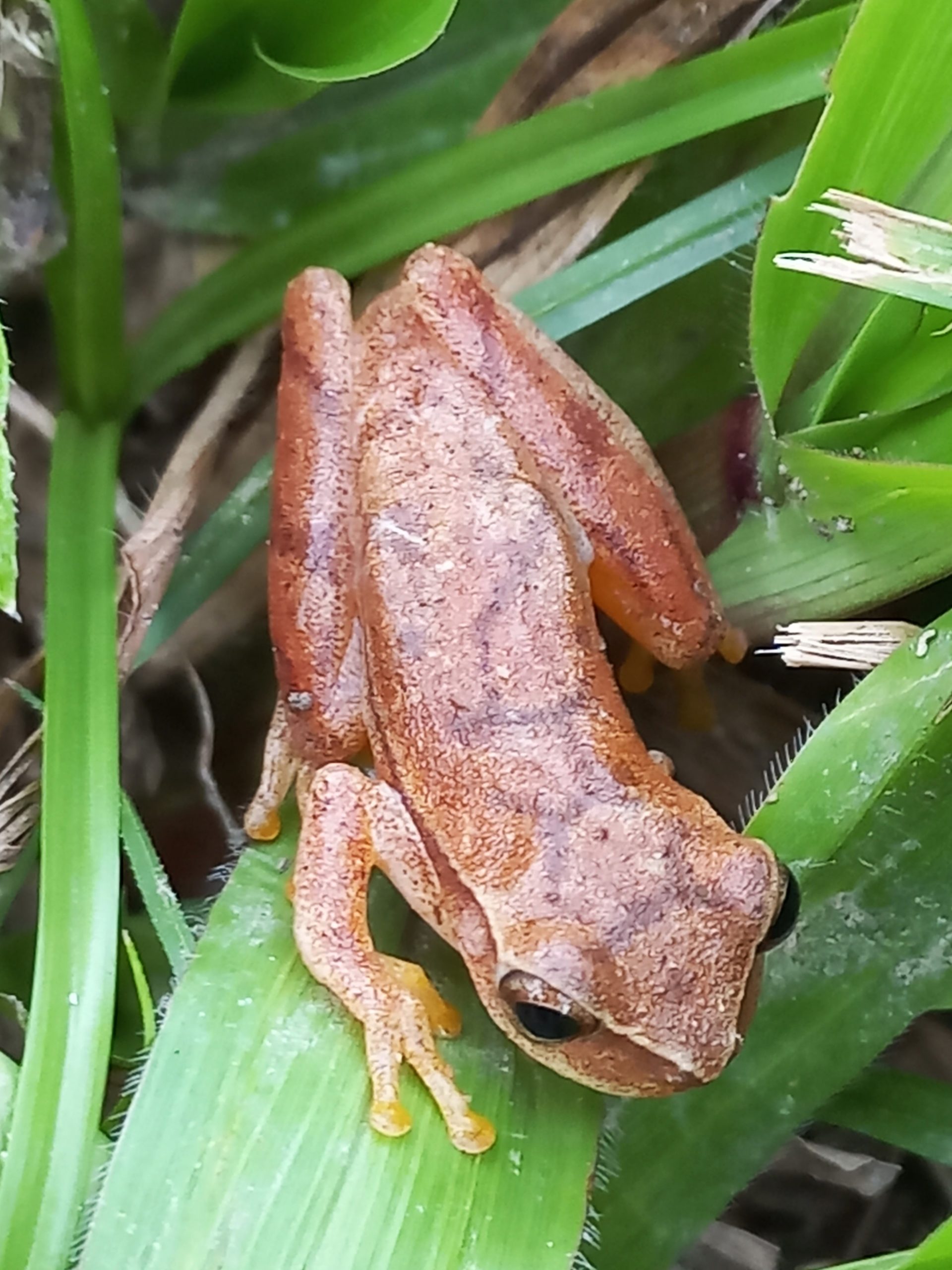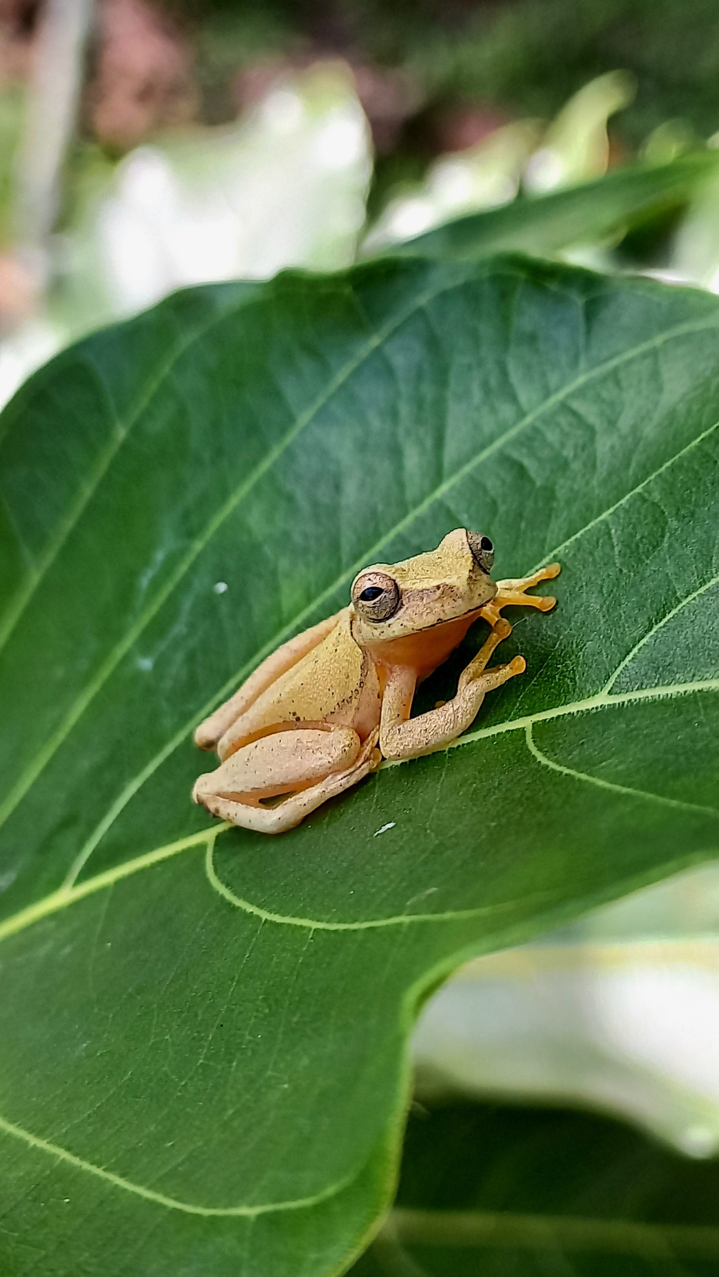 A common tree frog found around the house and sometimes inside the house.